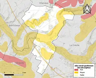 Les mouvements de terrains susceptibles de se produire sur la commune sont des tassements différentiels[17]. Le retrait-gonflement des sols argileux est susceptible d'engendrer des dommages importants aux bâtiments en cas d’alternance de périodes de sécheresse et de pluie[18]. 39,6 % de la superficie communale est en aléa moyen ou fort (54,9 % au niveau départemental et 48,5 % au niveau national)[Carte 2]. Depuis le , en application de la loi ELAN, différentes contraintes s'imposent aux vendeurs, maîtres d'ouvrages ou constructeurs de biens situés dans une zone classée en aléa moyen ou fort[Note 2],[19].