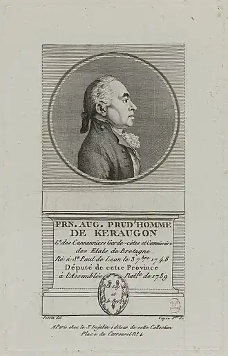 Fils de Joseph Prudhomme et d'Angélique-Pélagie Faisant, François Augustin Prudhomme de Kérangon se fait recevoir avocat au parlement et est nommé lieutenant des canonniers gardes-côtes à Saint-Pol-de-Léon et commissaire des États de Bretagne.