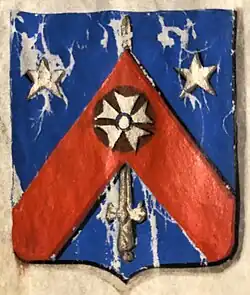 D'azur à l'épée haute en pal d'argent, accompagnée à dextre et à sénestre d'une étoile du même : chevron du tiers de l'écu de gueules au signe des chevaliers légionnaires brochant sur le tout. Livrées : les couleurs de l'écu . |
