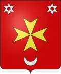 De gueules, à une croix de Malte d'or, accompagnée de deux molettes d'argent en chef, et d'un croissant du même en pointe.
