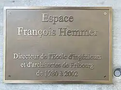 ) - ↑ cf. La photo de la plaque de l'Espace François Hemmer, sise à l'Ecole d'Ingénieurs de Fribourg (photo attachée au présent article).