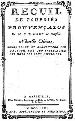 François Toussaint Gros en provençal Francés Toussaint Gros, (Marseille, 1698 - Lyon, 1748) est un écrivain provençal de langue d'oc.