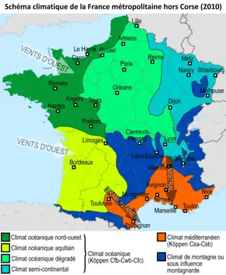 On distingue usuellement le climat océanique strict très marqué à l'ouest[17]. Il s'étend de la Flandre au Pays basque, sur une bande côtière de quelques dizaines de kilomètres (la limite est difficile à définir), plus étroite au nord et au sud, plus large en Bretagne qui est concernée en quasi-totalité par ce climat. Le climat océanique aquitain du sud-ouest est plus chaud, car plus au sud[18]. Le climat de la façade nord-ouest est océanique, mais plus frais que le climat océanique aquitain ; l'intensité des vents d'ouest y est beaucoup plus forte. Le climat océanique dégradé de plaine situé au centre-nord, est parfois appelé « parisien » car il correspond approximativement au bassin parisien, pour lequel le climat océanique est plus faiblement altéré. Le climat semi-continental au nord-est et au centre-est (Alsace, plaines de Saône ou du moyen-Rhône, plaines dauphinoises, auvergnates ou savoyardes) est lui-même subdivisé et possède des caractéristiques encore plus modifiées par le voisinage des massifs montagneux. Un climat semi-continental méridional caractérisé par un climat chaud existe dans les plaines de la vallée du Rhône autour de Lyon ainsi que celles du Forez. La Limagne et la région autour de Clermont-Ferrand connaît le même climat par l'effet de foehn et une position géographique dans la moitié sud de la France. Le climat semi-continental oriental quant à lui est présent de la Bourgogne jusqu'aux Ardennes. Les plaines ou bas-relief du littoral méridional et de la Corse ainsi que la basse vallée du Rhône sont pour leur part soumis au climat méditerranéen. Enfin le climat montagnard est présent, principalement en altitude dans les Alpes, les Pyrénées, le Massif central, les Vosges, le Jura et la montagne Corse.