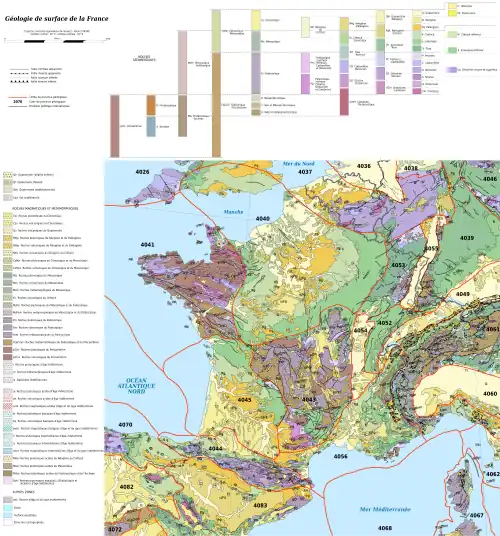 Le territoire métropolitain de la France offre une grande variété d'ensembles topographiques et de paysages naturels[b 1]. De vastes parties du territoire européen actuel de la France ont été soulevées lors de plusieurs épisodes tectoniques, notamment la surrection hercynienne à l'ère paléozoïque, qui est à l'origine des massifs armoricain, central, morvandiau, vosgien, ardennais et Corse[b 2]. Les massifs alpin, pyrénéen et jurassien sont eux beaucoup plus jeunes, et possèdent des formes moins érodées[b 2] — les Alpes culminent à 4 806 mètres d'altitude au mont Blanc[10]. Bien que 60 % des communes soient classées comme présentant des risques sismiques, ceux-ci restent modérés[11].