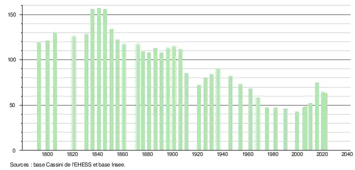 L'évolution du nombre d'habitants est connue à travers les recensements de la population effectués dans la commune depuis 1793. Pour les communes de moins de 10 000 habitants, une enquête de recensement portant sur toute la population est réalisée tous les cinq ans, les populations de référence des années intermédiaires étant quant à elles estimées par interpolation ou extrapolation[20]. Pour la commune, le premier recensement exhaustif entrant dans le cadre du nouveau dispositif a été réalisé en 2005[21].