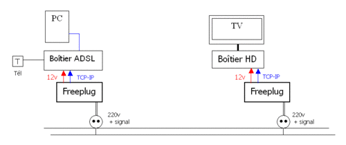 Un FreePlug est un bloc d'alimentation 12 V qui dispose d'une prise RJ45 en plus du cordon électrique. Les FreePlugs fonctionnent par deux ou plus, et doivent être raccordés dans le même segment du circuit électrique d'une habitation (le signal CPL ne passe pas en amont ou en aval de transformateurs, onduleurs, compteurs électroniques EDF). Dans le cas d'une installation triphasée, ils doivent être branchés sur la même phase (à moins d'installer un coupleur de phase dans le tableau électrique). Le boîtier est équipé de deux voyants, un voyant vert indiquant l'alimentation électrique et un voyant orange indiquant la bonne communication réseau entre les deux boîtiers. Il dispose aussi d'un bouton qui permet d'apparier les deux boîtiers et de réinitialiser la connexion. Il est possible d'associer par la suite d'autres boîtiers dans l'installation[1].