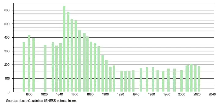 L'évolution du nombre d'habitants est connue à travers les recensements de la population effectués dans la commune depuis 1793. Pour les communes de moins de 10 000 habitants, une enquête de recensement portant sur toute la population est réalisée tous les cinq ans, les populations de référence des années intermédiaires étant quant à elles estimées par interpolation ou extrapolation[23]. Pour la commune, le premier recensement exhaustif entrant dans le cadre du nouveau dispositif a été réalisé en 2007[24].