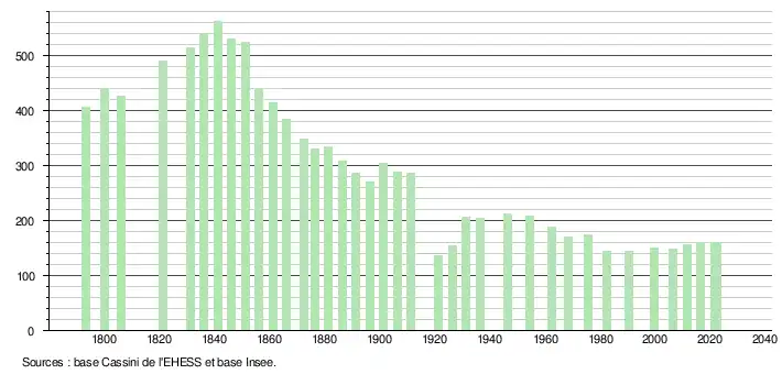 L'évolution du nombre d'habitants est connue à travers les recensements de la population effectués dans la commune depuis 1793. Pour les communes de moins de 10 000 habitants, une enquête de recensement portant sur toute la population est réalisée tous les cinq ans, les populations de référence des années intermédiaires étant quant à elles estimées par interpolation ou extrapolation[25]. Pour la commune, le premier recensement exhaustif entrant dans le cadre du nouveau dispositif a été réalisé en 2006[26].