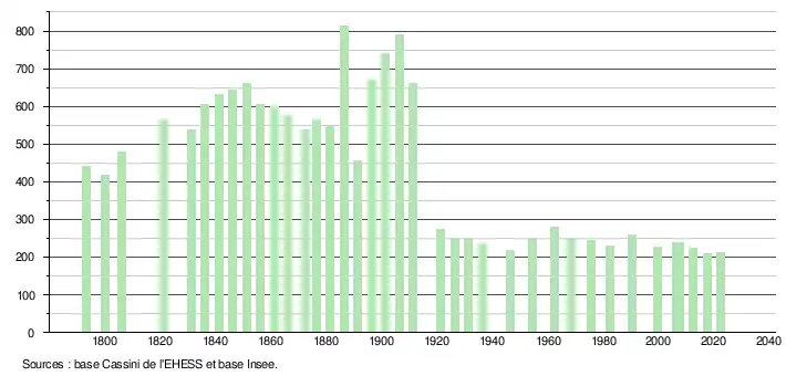 L'évolution du nombre d'habitants est connue à travers les recensements de la population effectués dans la commune depuis 1793. Pour les communes de moins de 10 000 habitants, une enquête de recensement portant sur toute la population est réalisée tous les cinq ans, les populations de référence des années intermédiaires étant quant à elles estimées par interpolation ou extrapolation[18]. Pour la commune, le premier recensement exhaustif entrant dans le cadre du nouveau dispositif a été réalisé en 2007[19].