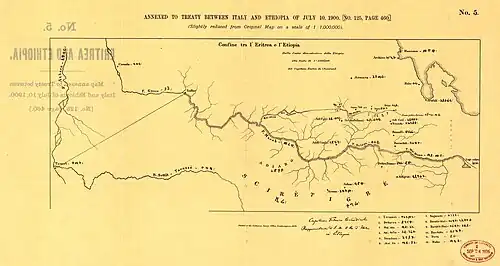 Après la défaite italienne à Adwa, l'Éthiopie renonce à un accès à la mer, et l'Italie à la conquête de l'Abyssinie. Les deux pays entreprennent alors de difficiles négociations frontalières. Après un premier accord formel en 1897 (ligne Tomat-Todluc-Mareb-Mai Ambessa-Saganeiti), elles aboutissent le à la conclusion d'un accord sur la partie nord du tracé, fixé sur la ligne Tomat-Todluc-Mereb-Belesa-Muna (voir carte ci-contre). Il consacre un recul éthiopien et la faiblesse de ce pays qui n'a pu conserver l'ensemble des hauts-plateaux[1]. Cet accord est publié en .