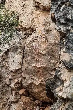 Les peintures schématiques des abris sous roche couvrent un espace lisse d'environ 40 cm de haut et entre 20 cm et 10 cm de large.