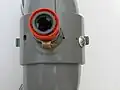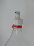La partie mâle est adaptée au goulot de la bouteille de manière étanche et devient la tuyère. Le plus facile, pour ce faire, est de percer le bouchon de la bouteille pour y insérer le raccord mâle réduit par limage[n 6]. Un tuyau de cinq mètres est fixé au raccord femelle et fermé à son extrémité par une valve de vélo qui permet de brancher la pompe et de conserver la pression.