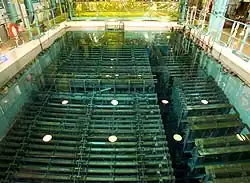 Après avoir été retirés du cœur d'un réacteur les éléments combustibles usés, qui continuent de dégager de la chaleur, sont entreposés dans une piscine de désactivation dont l'eau sert à la fois à les refroidir et à constituer une barrière (« blindage liquide ») aux rayonnements qu'ils émettent[10]. Le niveau d'une piscine doit être constamment contrôlé et sa température ne doit pas dépasser 25 °C, ce qui demande un refroidissement constant[10]. Chaque piscine de 12 mètres de profondeur peut accueillir des matières radioactives sur 4 m de hauteur[11]. Sur le site de Fukushima Daiichi, selon TEPCO, il y avait plus de matières radioactives dans les piscines que dans les réacteurs[11]. Elles contenaient au moment de l'accident 11 125 assemblages de combustible usés (près de quatre fois la quantité de produits radioactifs contenus dans les cœurs des six réacteurs)[11]. La piscine du réacteur no 4 (qui était à l'arrêt pour entretien) en contenait 1 331 assemblages en partie exposés à l'air[12].