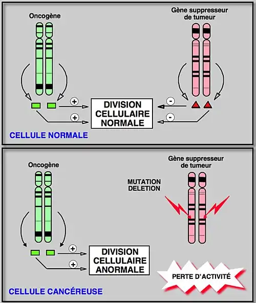 Contrairement aux oncogènes qui deviennent hyperactifs dans les cellules cancéreuses, les gènes suppresseurs de tumeurs perdent leur(s) fonction(s) dans les cancers humains. Il peut s'agir soit de délétions d'une région du chromosome contenant le gène, soit de mutations ponctuelles qui détruisent (ou altèrent) sa fonction. Le génome humain est diploïde, ce qui signifie que tous les gènes sont présents à l’état de deux copies par cellule, la copie du chromosome paternel et celle du chromosome maternel (on fait abstraction des chromosomes sexuels X et Y). Pour que la fonction d’un gène suppresseur soit perdue, il est nécessaire que les deux copies du gène soient inactivées (voir figure). Le premier gène suppresseur de tumeur, Rb1, a été découvert dans le rétinoblastome, un cancer de l’œil chez l’enfant. Par la suite de nombreux gènes suppresseurs ont été découverts. Certains sont inactivés dans des cancers très spécifiques, à l'instar de BRCA1 et BRCA2 dans les cancers du sein, d'APC dans les cancers du côlon, ou de WT1 dans les cancers du rein. D’autres gènes suppresseurs de tumeurs ont un spectre d’inactivation plus large comme p53 or p19ARF qui sont inactivés dans un grand nombre de types de cancer.