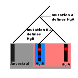 En outre les dix hommes qui portent le chromosome avec la mutation A sont les descendants directs en ligne masculine du même homme qui fut le premier à porter la mutation. Le premier homme qui porta la mutation B fut aussi un descendant direct en ligne masculine de cet homme, mais est aussi ancêtre direct masculin de tous les hommes portant la mutation B. Des séries de mutations forment des lignages moléculaires. En plus chaque mutation SNP peut définir un ensemble de chromosomes Y spécifiques qu'on appelle haplogroupe.