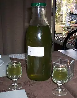 - prendre de l'alcool pur (90-95°) au goût aussi neutre que possible : on fera donc macérer les 40 brins dans un demi-litre d'alcool coupé (immédiatement ou plus tard) avec un demi-litre d'eau.