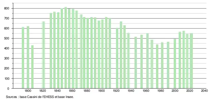 L'évolution du nombre d'habitants est connue à travers les recensements de la population effectués dans la commune depuis 1793. Pour les communes de moins de 10 000 habitants, une enquête de recensement portant sur toute la population est réalisée tous les cinq ans, les populations de référence des années intermédiaires étant quant à elles estimées par interpolation ou extrapolation[41]. Pour la commune, le premier recensement exhaustif entrant dans le cadre du nouveau dispositif a été réalisé en 2006[42].