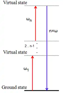 Dans un milieu ayant une susceptibilité non linéaire suffisamment grande, la génération d'harmonique est possible. Notez que pour les ordres pairs (n = 2, 4, ...), le milieu ne doit pas avoir de centre de symétrie (être non-centrosymétrique)[1].