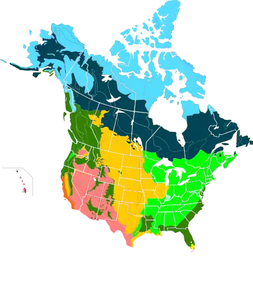 | Les principaux types d'habitats des États-Unis et du Canada | Carte des écorégions du Canada, des États-Unis et du Mexique |