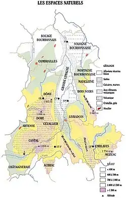 La région est structurée par un socle granitique et métamorphique formé à l’ère primaire il y a 350 millions d’années (carbonifère). Ces sommets hercyniens ont été transformés en pénéplaine à l’ère secondaire puis ont été recouverts de sédiments marins. Ceux-ci ont été dégagés à l’ère tertiaire il y a 35 millions d’années (oligocène). L’orogenèse des Pyrénées et des Alpes a provoqué un relèvement de l’altitude du socle et l’a basculé vers l’ouest. La dislocation du socle a suivi des axes nord-sud et a créé une mosaïque de blocs appelés « horsts » pouvant s’élever jusqu’à 1 631 mètres d’altitude (Pierre-sur-Haute) et en bassins d’effondrements (futures Limagnes). Ces fossés d’effondrement se sont comblés par une sédimentation détritique drainée par les cours d’eau. Ces mouvements se sont prolongés au miocène.