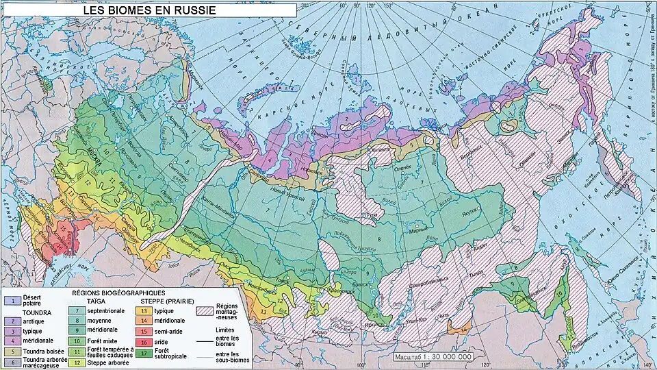 Plus au sud, dans les régions où le gel devient moins présent (température moyenne du mois le plus chaud > 10 °C), peut se développer la taïga, une forêt composée de résineux résistant au gel (mélèzes, pins et pins de Sibérie) avec des bouleaux et des trembles au nord. La taïga constitue une bande relativement étroite en Russie européenne car elle est rapidement remplacée par des terres plus fertiles plus au sud. Son domaine s'élargit en allant vers l'est et en Sibérie orientale elle s'étend pratiquement jusqu'à la frontière méridionale qui sépare la Russie de la Mongolie et de la Chine. Sur la bordure méridionale et occidentale de la taïga se développent les feuillus et la forêt devient mixte, comme dans la région de Moscou. La transition est progressive avec des incursions de la taïga dans le domaine de la toundra dans des cuvettes abritées ou au contraire l'extension de la toundra dans les terres situées en altitude car plus froides (toundra alpine) comme dans l'Oural. 60 % du territoire russe est couvert par la taïga. Cette forêt boréale résiste aux froids intenses du climat continental, mais se renouvelle en moyenne deux à trois fois moins vite que son homologue d'Europe occidentale. En été, dans la toundra comme dans une bonne partie de la taïga, le dégel ne touche que la surface : héritage de la dernière ère glaciaire le sol reste souvent gelé (pergélisol) sur une profondeur pouvant atteindre 1000 à 1 500 mètres en république de Sakha. Ce phénomène est à l'origine des nombreux marécages et lacs qui couvrent 13,2% de la surface du pays (plus de 2 millions km²). Au printemps, les plaines deviennent marécageuses et infestées de moustiques (par exemple marais de Vassiougan)[7].