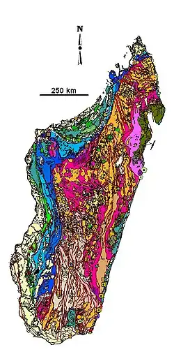 La géologie de Madagascar correspond à la composition, la structure et l'évolution des couches internes et externes des roches situées dans le pays et de l'île du même nom, ainsi que de ses îles côtières. Cette géologie se caractérise par une variété de roches datant du Précambrien qui constituent la plus grande partie de l'Est et du centre de l'île. Elles-mêmes sont percées par des intrusions de basaltes et des rhyolites du Mésozoïque au Cénozoïque. En revanche, l'ouest de l'île est formée de roches sédimentaires du Carbonifère au Quaternaire. Des roches de l'Archéen se trouvent au nord-est de l'île, vers le sud de la zone de cisaillement de Ranotsara. Les roches du nord de Madagascar sont des ceintures de roches vertes formées pendant l'Archéen ou le Paléoprotérozoïque[1].