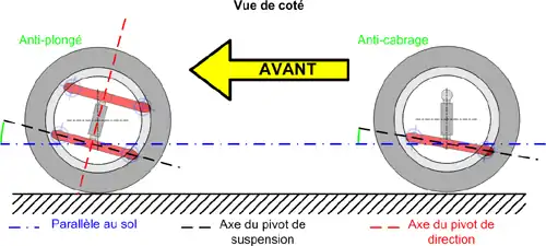 Note: le dessin de l'anti-plongée n'est pas juste, il est à l'envers; pour l'anti-plongée au freinage, l'axe du pivot de suspension doit être incliné vers l'avant (revue technique citroën bx)