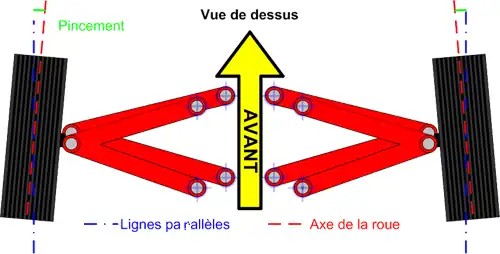 On dit qu'il y a « pincement » quand les plans de roues tendent à se croiser devant le train roulant étudié. On mesure cette valeur en degrés et minutes[1].