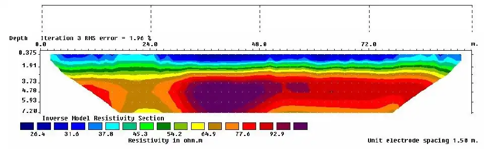 Dans un premier temps, on implante le long du profil que l’on veut étudier, des électrodes espacées à un intervalle constant (en général 5 mètres). Ensuite, on raccorde chacune d’entre elles à un multinode. Cet appareil permet de « reconnaître » chacune des électrodes (connaître leur emplacement, leur ordre…). Enfin, on utilise un multiplexeur pour pouvoir attribuer un rôle à chaque électrode. Le tout est relié à un résistivimètre qui effectuera les mesures automatiquement. Pour ce profil, on utilisera uniquement un dispositif Wenner-Alpha (écartement entre les électrodes identique).