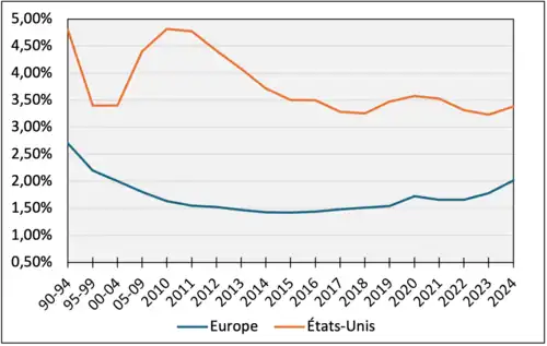 Souvent annoncé, le déclin américain au profit de l'Asie ne résulterait que d'une évolution lente : à la fin du premier quart du XXIe siècle, les États-Unis restent la première puissance mondiale en termes politiques, économiques et militaires. En revanche, le déclin relatif de l'Europe[note 5] depuis la fin du XXe siècle est une réalité qui devrait s'accentuer selon les projections démographiques et économiques réalisées par l'ONU[23], le FMI et la Banque mondiale[24] ainsi que par la Commission européenne[25].