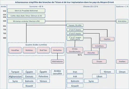 Mais derrière cette unité apparente, le schisme chiite et la diversité de communautés d'écoles juridiques[36],[37] est une cause de tensions entre les États où l'islam sunnite demeure la référence et ceux, moins nombreux, où le chiisme est majoritaire ou bien dont la minorité est suffisamment importante pour s'imposer[34],[38],[39]. La fracture qui scinde l'islam en deux branches principales, le sunnisme et le chiisme, intervient moins de trente ans après la mort du prophète Mahomet. À la même époque, une troisième branche d'orientation rigoriste apparaît, les khâridjites, dont les descendants, les Ibadites, vivent principalement à Oman. L'islam sunnite rassemble de nos jours environ 85 % des musulmans, tandis que les chiites en représentent moins de 15 % et les Ibadites moins de 1 %[38]. Le hadj, pèlerinage annuel à La Mecque où se rendent 2 à 3 millions de pèlerins, illustre ces tensions. l'Arabie saoudite qui l'organise en tire un prestige important sur lequel elle s'appuie pour s'affirmer comme le leader de l'islam sunnite aux dépens de l'Égypte et surtout des mollahs au pouvoir en Iran pour qui elle est le principal obstacle à leur ambition de se poser en guides de l'islam mondial et de faire de la république islamique d'Iran le modèle du véritable État islamique[40].