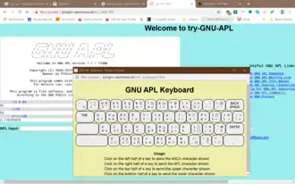GNU APL a été porté en Javascript par Th. Baruchel et est accessible sous cette forme sur le site à l'adresse http://baruchel.hd.free.fr/apps/apl/ (voir illustration de gauche). Junger Sauermann propose également sa propre version d'essais interactifs http://juergen-sauermann.de/try-GNU-APL, à droite :