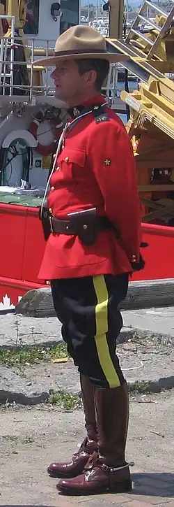 L'uniforme provenait originellement des magasins de la milice canadienne et comportait plusieurs variantes, selon la milice de provenance, mais fut rapidement standardisé. Des épaulettes bleues furent ajoutées durant les années 1920 après avoir obtenu le titre « Royal », remplaçant des épaulettes écarlates à bord doré. Les pantalons étaient initialement chamois mais les membres de la NWMP échangeaient souvent avec les troupes américaines le long de la frontière et la couleur bleue de pantalons utilisés maintenant pourrait provenir de là. La bande jaune est une autre tradition britannique. Les policiers de rang inférieurs à inspecteur portent des gorgerins bleus stylisés sur le collet. Les officiers supérieurs ont un collet bleu plein et des manches se terminant par des pointes bleues. Le NWMP portait au départ le casque colonial anglais qui n'était pas très pratique dans la vie quotidienne. Les membres adoptèrent donc des couvre-chefs à large bord pour patrouiller, ceux-ci offrant plus de protection contre le soleil, la pluie ou la neige. Sam Steele est souvent crédité pour l'introduction des chapeaux de style Stetson. Il ne fut cependant officiellement adopté qu'en 1904 mais déjà un contingent de la NWMP au jubilé de diamant de la reine Victoria portait ce couvre-chef et les membres du Lord Strathcona's Horse de la guerre des Boers l'utilisaient. En 1873, les bottes étaient noires et le ceinturon était une double ceinture de balles sans baudrier puisque la carabine était l'arme habituelle.