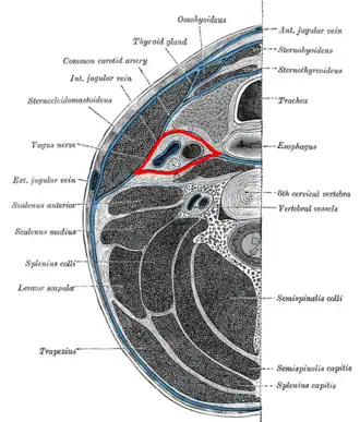 La gaine carotidienne est constitué par les lames superficielle, prétrachéale et prévertébrale du fascia cervical. Elles forment une structure tubulaire verticale de la base du crâne à la première côte et au sternum[1] (entre C7 et T4). Un septum divise le canal en trois compartiments.