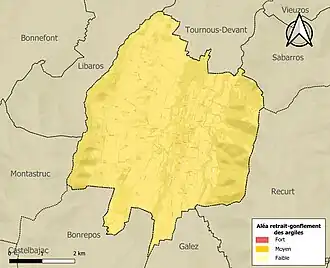 Le retrait-gonflement des sols argileux est susceptible d'engendrer des dommages importants aux bâtiments en cas d’alternance de périodes de sécheresse et de pluie. La totalité de la commune est en aléa moyen ou fort (44,5 % au niveau départemental et 48,5 % au niveau national). Sur les 320 bâtiments dénombrés sur la commune en 2019, 320 sont en aléa moyen ou fort, soit 100 %, à comparer aux 75 % au niveau départemental et 54 % au niveau national. Une cartographie de l'exposition du territoire national au retrait gonflement des sols argileux est disponible sur le site du BRGM[20],[Carte 3].