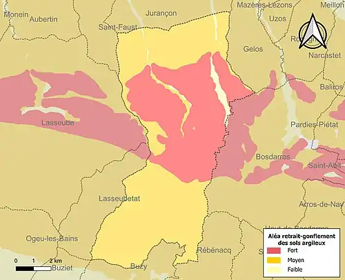 Le retrait-gonflement des sols argileux est susceptible d'engendrer des dommages importants aux bâtiments en cas d’alternance de périodes de sécheresse et de pluie[31]. 98 % de la superficie communale est en aléa moyen ou fort (59 % au niveau départemental et 48,5 % au niveau national)[Carte 5]. Depuis le , en application de la loi ELAN, différentes contraintes s'imposent aux vendeurs, maîtres d'ouvrages ou constructeurs de biens situés dans une zone classée en aléa moyen ou fort[Note 10],[32].