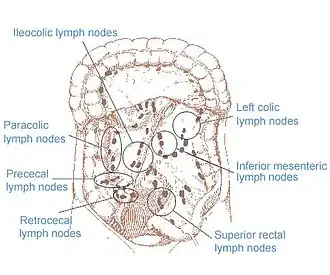 - ↑ Kim, Lee, Yu et Kim, « The clinicopathological significance of inferior mesenteric lymph node metastasis in colorectal cancer », European Journal of Surgical Oncology, vol. 30, no 3, , p. 271–279 (PMID 15028308, DOI 10.1016/j.ejso.2003.12.002)