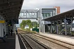 Une passerelle accessible par des escaliers mécaniques et des ascenseurs[11] permet le passage d'un quai à l'autre, ainsi que l'accès à l'aérogare.