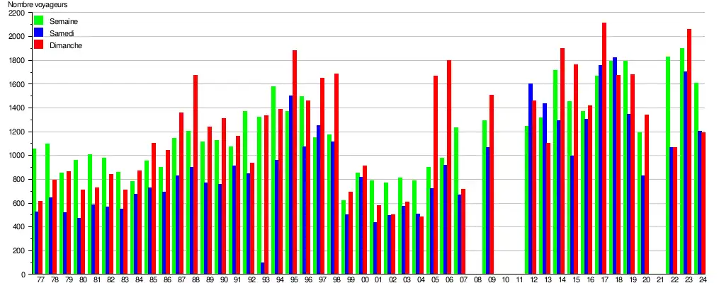 Ce graphique et tableau montre le nombre de voyageurs embarquant en moyenne durant la semaine, le samedi et le dimanche[13].