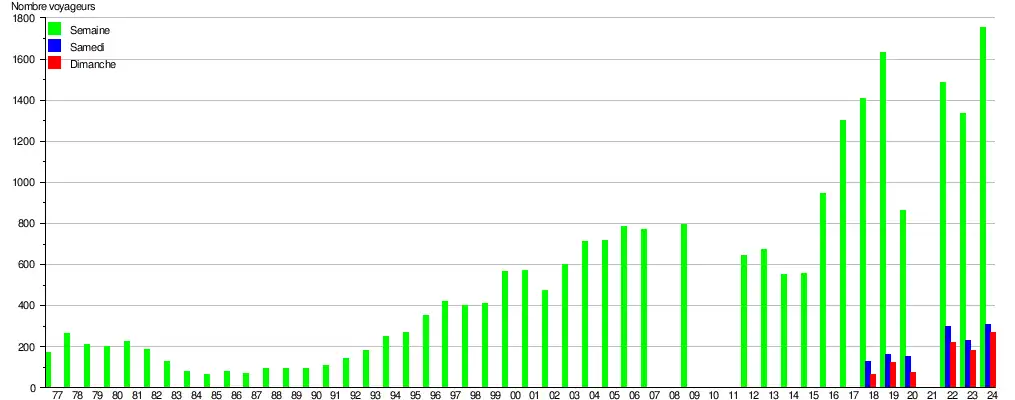 Ce graphique et tableau montre le nombre de voyageurs embarquant en moyenne durant la semaine, le samedi et le dimanche[7].