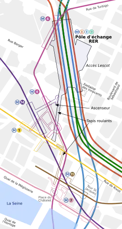 La gare se trouve au-dessous du centre commercial du Forum des Halles et de La Canopée. Elle forme avec les stations de métro Châtelet et Les Halles un vaste réseau souterrain. Le couloir de correspondance avec la station de métro Châtelet est équipé de trois tapis roulants parallèles de plus de 150 mètres de long[18].