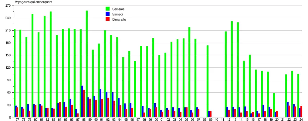 Le graphique et le tableau montrent le nombre de passagers qui en moyenne embarquent durant la semaine, le samedi et le dimanche[8].