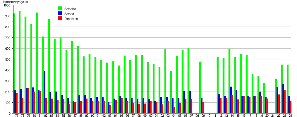 Ce graphique et tableau montre le nombre de voyageurs embarquant en moyenne durant la semaine, le samedi et le dimanche[13].