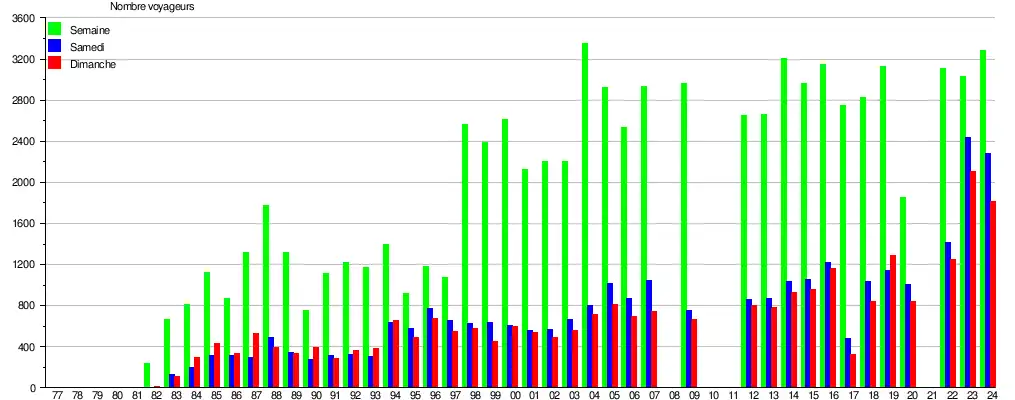 Ce graphique et tableau montre le nombre de voyageurs embarquant en moyenne durant la semaine, le samedi et le dimanche[11].