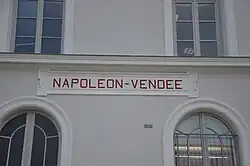 - ↑ En 1804 La Roche-sur-Yon est préférée, par Napoléon, à Fontenay, considérée comme trop excentrée, pour devenir un chef-lieu. Pour être à la hauteur de ce choix, la petite localité est totalement reconstruite pour devenir une « importante citée administrative et militaire. Elle est renommée Napoléon Vendée en 1852 »[3]. Elle conserve ce nom tout le Second Empire et ce nom est toujours inscrit sur le bâtiment de la gare.