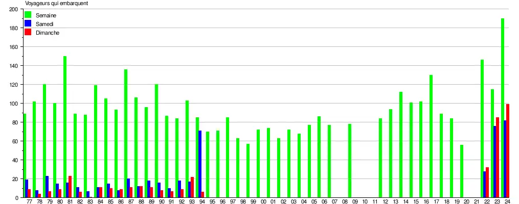 Le graphique et le tableau montrent le nombre de passagers qui en moyenne embarquent durant la semaine, le samedi et le dimanche[9].
