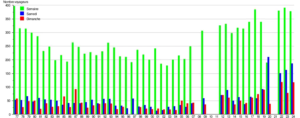 Ce graphique et tableau montre le nombre de voyageurs embarquant en moyenne durant la semaine, le samedi et le dimanche[10].