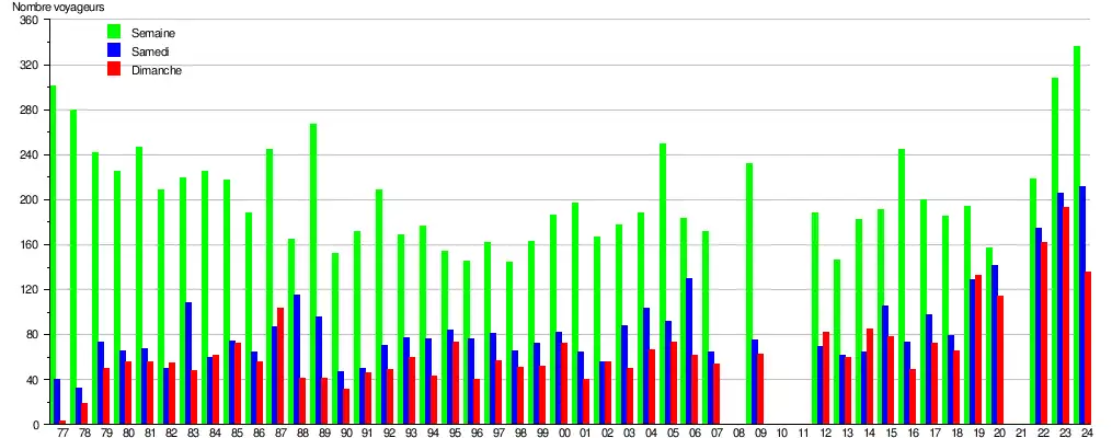 Ce graphique et tableau montre le nombre de voyageurs embarquant en moyenne durant la semaine, le samedi et le dimanche[12].