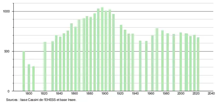 L'évolution du nombre d'habitants est connue à travers les recensements de la population effectués dans la commune depuis 1793. Pour les communes de moins de 10 000 habitants, une enquête de recensement portant sur toute la population est réalisée tous les cinq ans, les populations de référence des années intermédiaires étant quant à elles estimées par interpolation ou extrapolation[16]. Pour la commune, le premier recensement exhaustif entrant dans le cadre du nouveau dispositif a été réalisé en 2007[17].