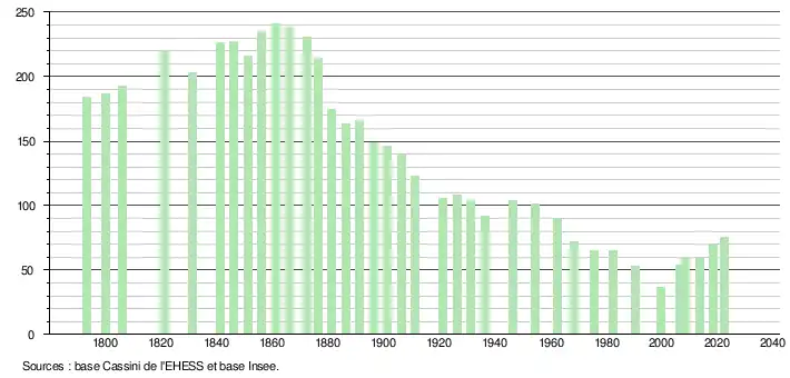 L'évolution du nombre d'habitants est connue à travers les recensements de la population effectués dans la commune depuis 1793. Pour les communes de moins de 10 000 habitants, une enquête de recensement portant sur toute la population est réalisée tous les cinq ans, les populations de référence des années intermédiaires étant quant à elles estimées par interpolation ou extrapolation[24]. Pour la commune, le premier recensement exhaustif entrant dans le cadre du nouveau dispositif a été réalisé en 2008[25].